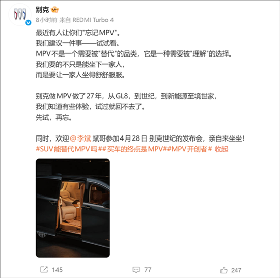 别克表示,多年的产品体验与用户反馈,证明了MPV品类的不可替代性。此外,别克还邀约了李斌4月28日出席别克的世纪发布会。